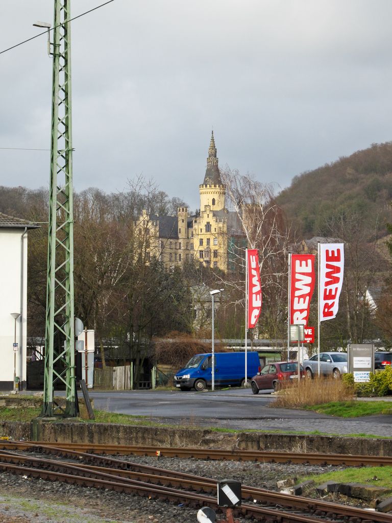После долгожданного окончания переговоров, на которых я тщетно пытался понять, что я здесь делаю, турок настаивал на том, чтобы отвезти меня хотя бы до Кёльна, поскольку далее мой путь лежал в Нидерланды. Но он уже порядком мне надоел, поэтому я попросил подбросить меня до вокзала, решив, что, отвязавшись там от него, я смогу хотя бы раз пройти по набережной Рейна и, возможно, даже сделать несколько фотографий на память. Не тут-то было! Заботливый Мехмет привез меня на станцию, купил мне билет до голландского Венло (Venlo) и простоял со мной почти все время до прихода поезда, пока окончательно не замерз... Поэтому ниже привожу единственную фотографию из Бад-Хённингена, на которой видна привокзальная территория и виднеющийся из-за деревьев неоготический замок Аренфельс (Schloß Arenfels).