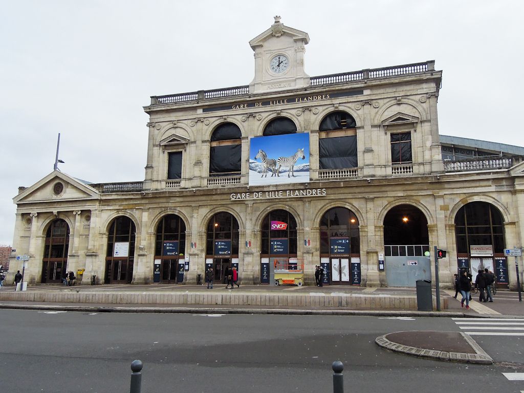 Первая железнодорожная станция в Лилле была построена в 1842 г., но через полвека она стала мала быстро растущему городу. В это время в Париже перестраивали знаменитый Северный вокзал (Gare du Nord). В целях экономии средств и времени было решено разобрать фасад парижского вокзала, по частям перевезти его в Лилль и здесь собрать заново, слегка видоизменив и дополнив. В числе прочего, новый вокзал Gare de Lille, строительство которого было закончено в 1892 г., обзавелся большими часами с городским гербом. В 1993 г. для нужд скоростных железнодорожных линий, связывающих Лилль с Брюсселем и Амстердамом на востоке, Лондоном на западе и Марселем на юге, город обзавелся еще одним вокзалом, получившим название "Европа" (Gare de Lille Europe). Одновременно и к названию старого лилльского вокзала добавили слово "Фландрия" (Flanders), поскольку здесь с тех пор обслуживались лишь региональные поезда - Лилль является центром одноименного французского региона, - причем не только французские, но и прибывающие из той части исторической Фландрии, что расположена на территории Бельгии. На одном из таких поездов, купив билет стоимостью в 8 EUR, я и прибыл в Лилль из бельгийского местечка Варегем (Waregem), о котором я уже писал ранее.